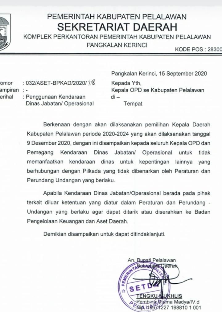Surat dengan nomor: 032/ASET-BPKAD/2020/718 diterbitkan tanggal 15 September 2020 ditujukan kepada kepala OPD se-kabupaten Pelalawan. Surat ini, ditandatangani Tengku Mukhlis pembina utama madya/IV.d atas nama bupati Pelalawan.