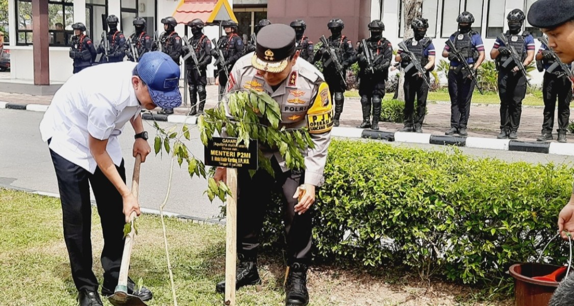 Pekanbaru,(Riausindo.com) – Sebuah momen sederhana namun penuh makna terjadi di halaman Mapolda Riau, Kamis (17/07/2025). Sebuah pohon Gaharu, simbol ketahanan, harapan, dan nilai tinggi ditanam langsung oleh Menteri Perlindungan Pekerja Migran Indonesia (P2MI), Abdul Kadir Karding.