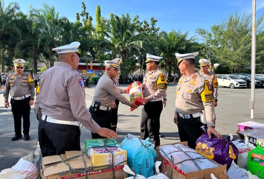 Sebagai bentuk solidaritas, Ditlantas Polda Riau menyerahkan bantuan paket sembako yang dihimpun dari seluruh personel.