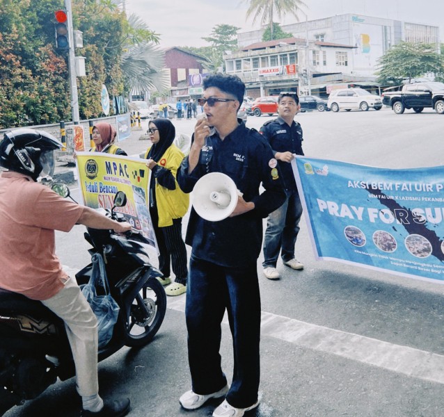 PEKANBARU, (Riausindo.com) - 5 Desember 2025 – Badan Eksekutif Mahasiswa Fakultas Agama Islam Universitas Islam Riau (BEM FAI UIR) dengan sigap menggelar aksi kemanusiaan dalam bentuk penggalangan dana untuk membantu masyarakat yang terdampak bencana banjir bandang dan longsor di Provinsi Aceh, Sumatera Utara, dan Sumatera Barat. Inisiatif ini merupakan respons terhadap musibah yang melanda beberapa wilayah di Pulau Sumatra, sebagai bentuk solidaritas dan kepedulian terhadap sesama.