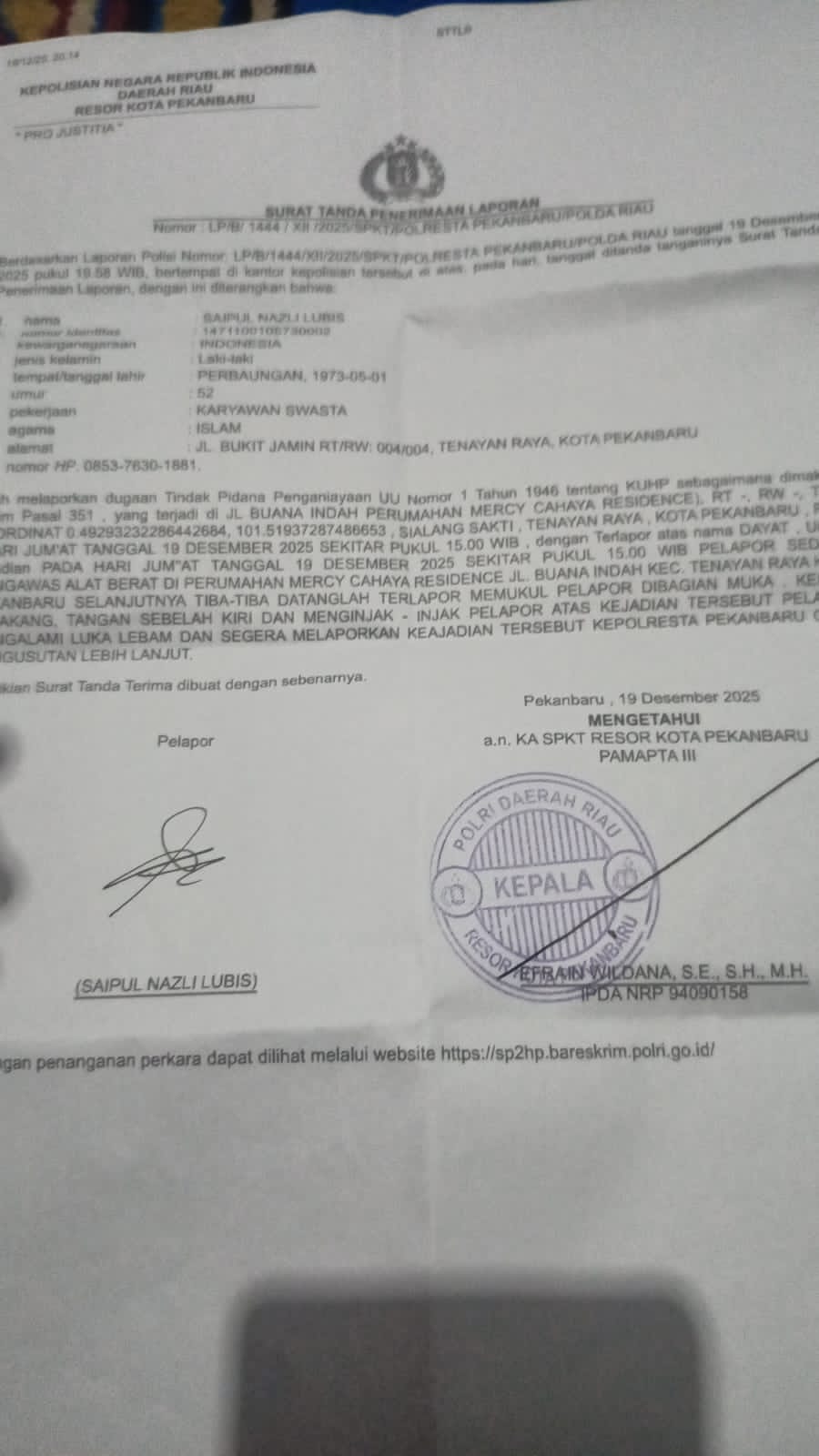 PEKANBARU,(Riausindo.com) – Seorang warga Kota Pekanbaru, Saipul Nazli Lubis (52), melaporkan dugaan tindak pidana penganiayaan ke Polresta Pekanbaru, Polda Riau, Jumat (19/12/2025).