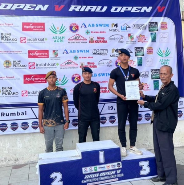 Pekanbaru,(Riausindo.com) – Personel Satuan Brimob Polda Riau kembali menorehkan prestasi membanggakan di tingkat nasional. Bripda Dimas Aryo Giofanny berhasil mengharumkan nama institusi dengan meraih Juara 3 kategori Senior pada nomor 100 Meter Gaya Dada Putra serta 100 Meter Gaya Bebas dalam ajang Swimming Championship Se-Indonesia Tahun 2025 yang digelar di Kolam Renang Aquatic Center Rumbai, Kota Pekanbaru,Minggu (21/12/2025)
