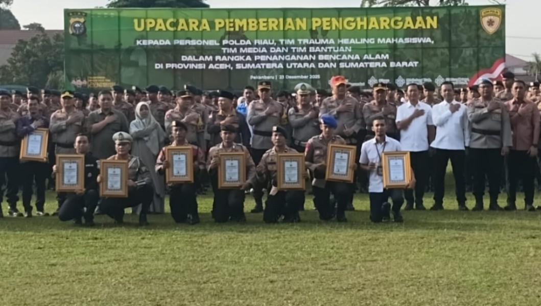 Pekanbaru,(Riausindo.com) – Kepolisian Daerah (Polda) Riau memberikan penghargaan kepada personel Polda Riau, Tim Trauma Healing, Tim Media, mahasiswa, serta tim bantuan lainnya yang terlibat dalam penanganan bencana alam di Provinsi Aceh, Sumatera Utara, dan Sumatera Barat.