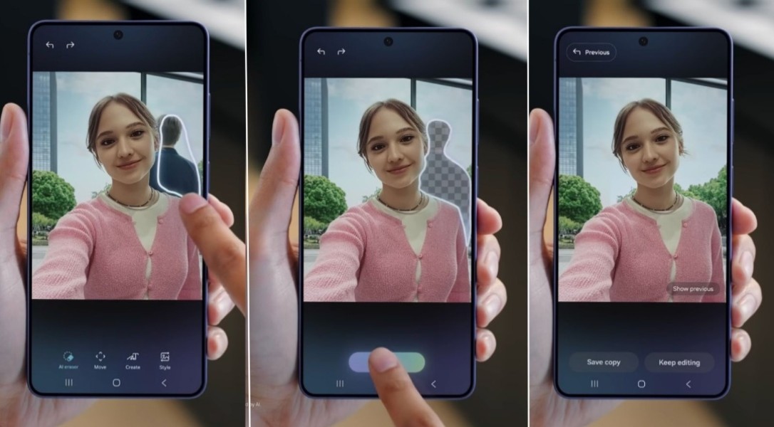 Melalui Photo Assist, pengguna dapat menghapus objek mengganggu hanya dengan melingkari bagian yang ingin dihilangkan, lalu Galaxy AI akan mengisi area tersebut secara otomatis agar tampak menyatu dengan latar belakang.